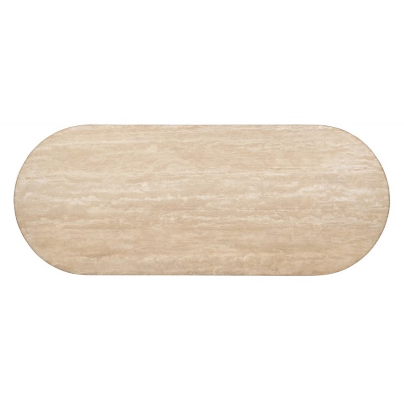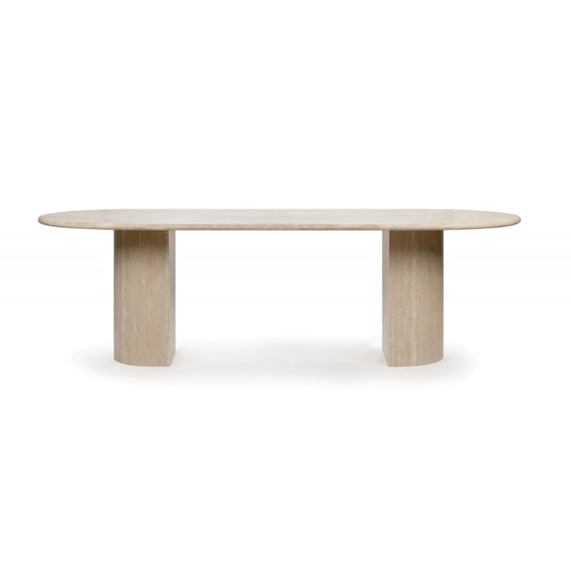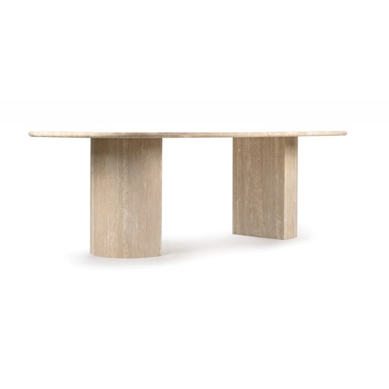 La table de salle à manger en travertin Dona est une version moderne et piètement originale, avec deux pieds demi-lune et un généreux plateau ovale, qui permet d'accueillir facilement des couverts supplémentaires, ce qui en fait un choix idéal pour ceux qui aiment recevoir.